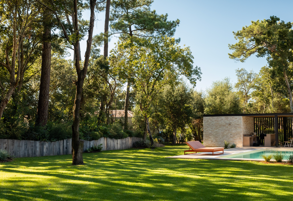 À Hossegor, sur une parcelle typiquement landaise, plane et sablonneuse, ce projet de jardin devait accompagner la reconstruction complète d’une maison d’architectes tout en répondant à un enjeu majeur : comment créer de l’intimité sans rompre avec l’esprit naturel du lieu ? Aux commandes, Benoît Rey, gérant de L’Atelier du Paysagiste, a façonné un poumon vert intégrant la maison dans le paysage grâce à un talus sculpté à l’aide de berlinoises en chêne massif.